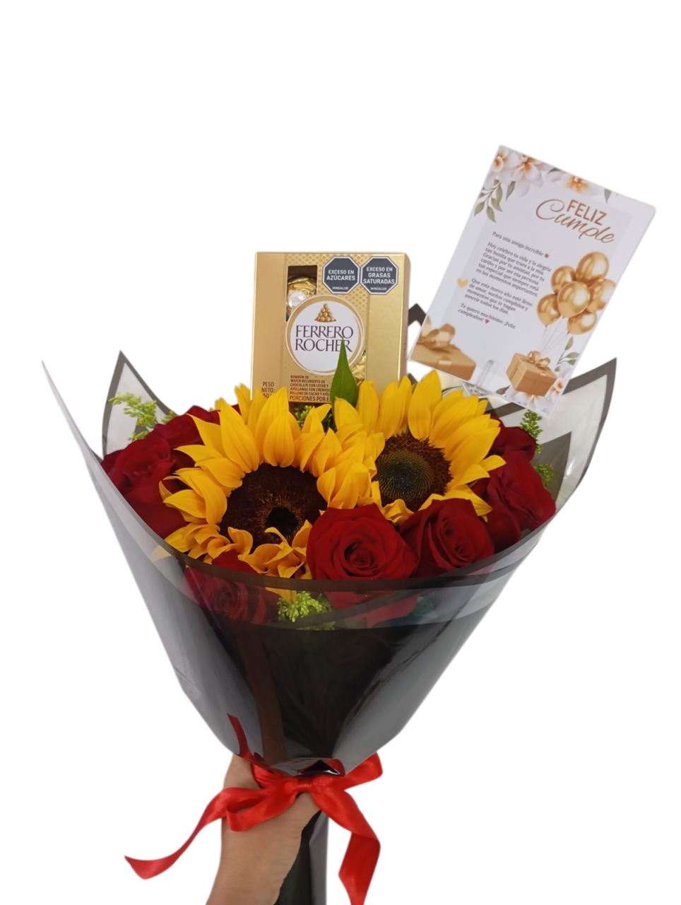 Bouquet de rosas y girasoles más caja x4 de ferrero.