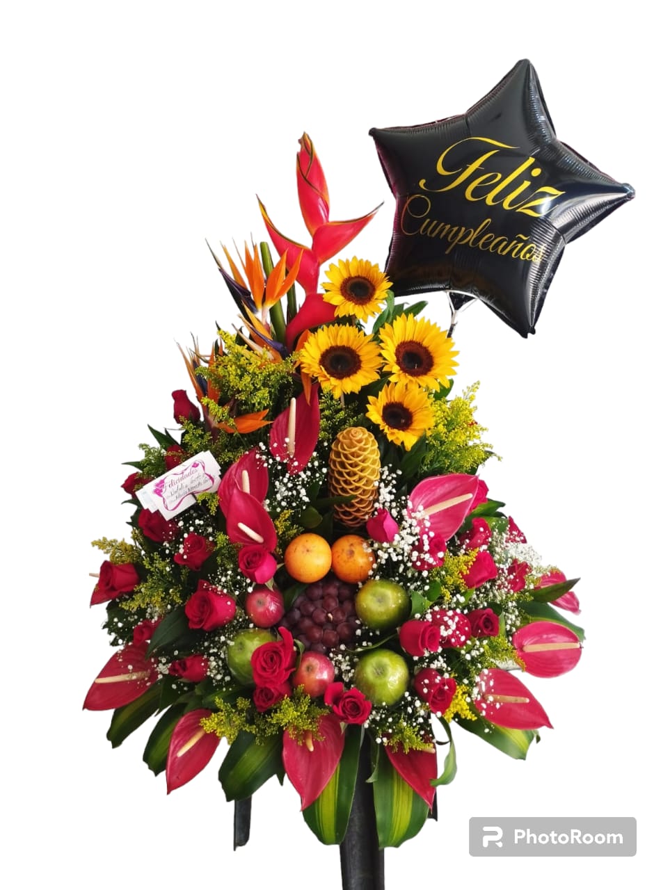 Arreglo floral con frutas en su interior